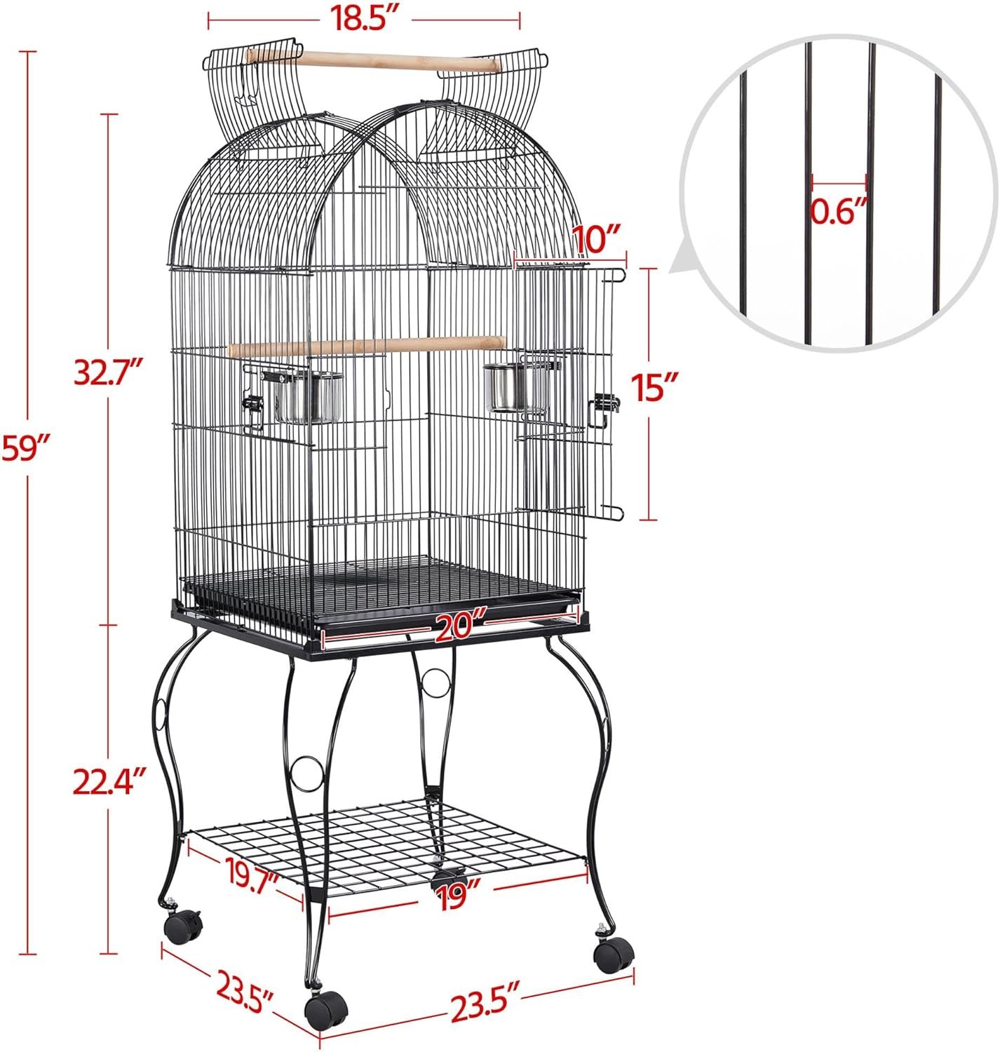 Pet parents friendly designs: Thanks to the feeder doors, feeders can be accessed outside the cage so that you don’t need to frighten your easily-scared friends when refilling the feed. Another thoughtful design for pet parents is the extra storage shelf on the stand. It can keep bird cage cleaning tools, bird seeds and toys handy and neat.