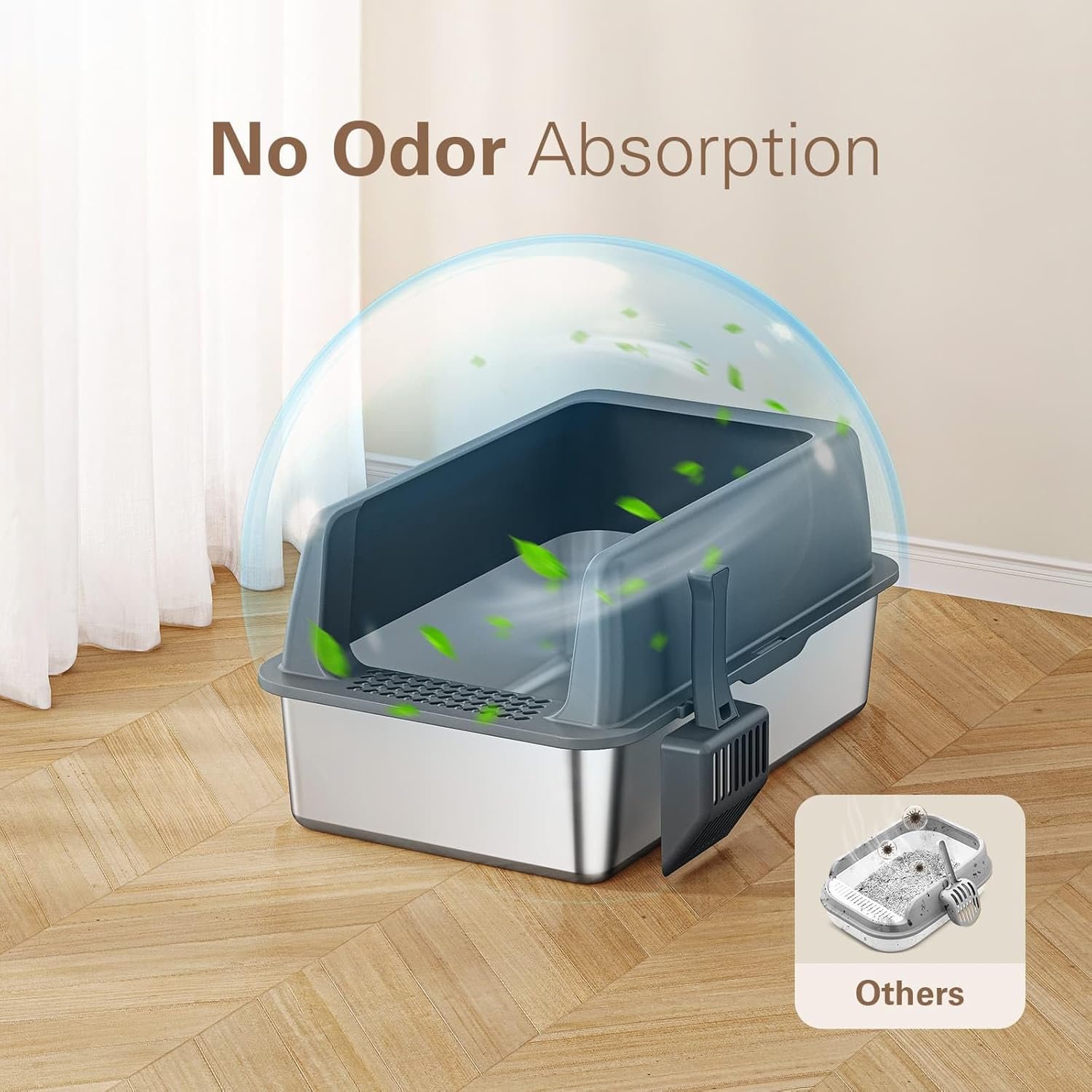 【Sturdy Stainless Steel Build】: Constructed from thick stainless steel for added durability, the stainless steel litter box is designed to withstand daily use, resisting rust and scratches from cat paws. The non-porous nature feature of stainless steel litter box also prevents odors from lingering, extending the lifespan and reducing the need for frequent replacement.
