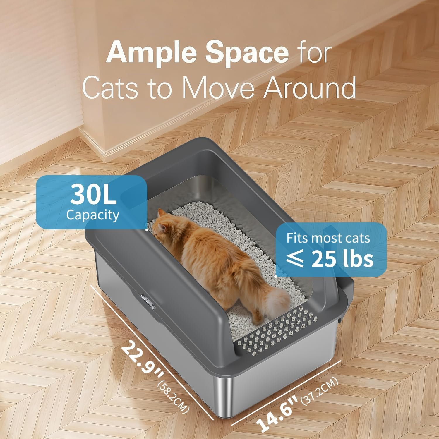 【Ample Space for Big Cats or Multiples】: Measuring 23″ L x 14.5″ W x 10.2″ H, the stainless steel cat litter box is roomy enough for cats of all sizes to comfortably move around during their business. The large cat litter box has a capacity of 20 liters, reducing the need for frequent cleanups and allowing you to leave home with peace of mind for up to 30 days.