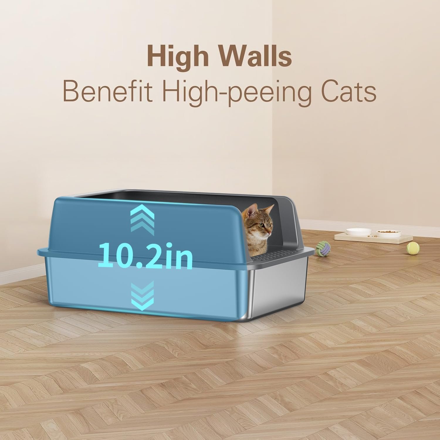 One special features of the large stainless steel litter box is its 10.2-inch curved high walls, that effectively minimizes litter spillage and urine leakage while providing a sense of privacy for cats.