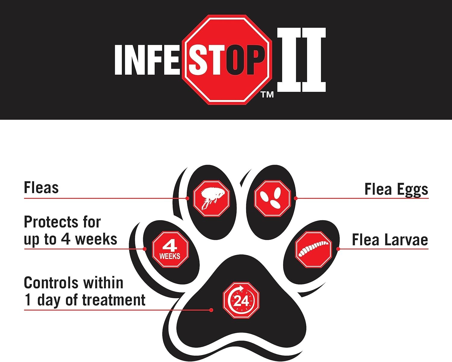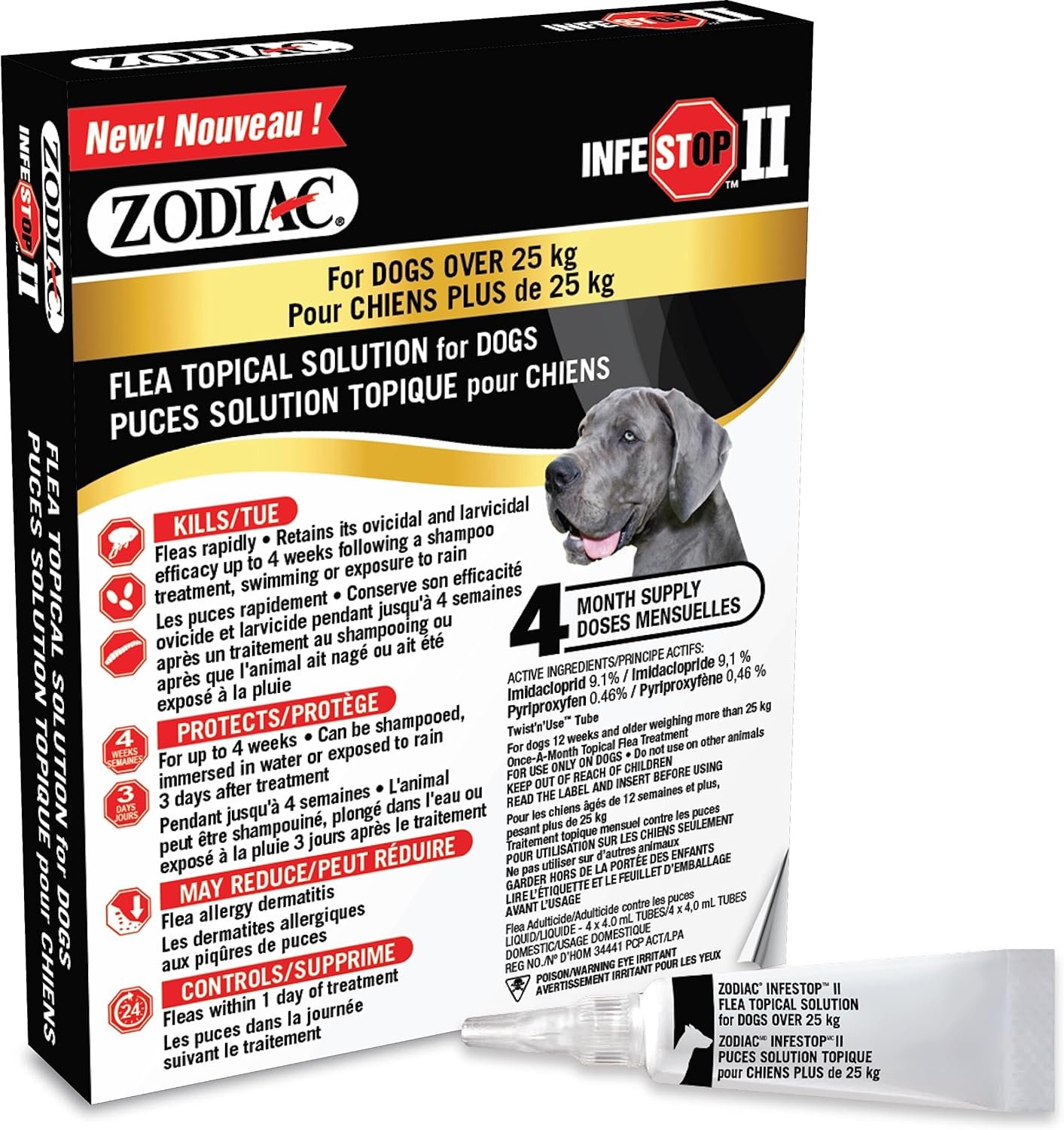 ZODIAC INFESTOP II FLEA TOPICAL SOLUTION FOR DOGS OVER 25kg. If you prefer the use of topicals, ZODIAC Infestop II for Dogs Over 25kg offers an easy to use, effective and economical alternative. These products are designed to be used Once-A-Month. TRUSTED/PROVEN: VET TECHNOLOGY* *SAME ACTIVE INGREDIENT AS IN ADVANTAGE II AVAILABLE WITHOUT A VISIT TO THE VET Kills fleas rapidly Retains its ovicidal and larvicidal efficacy for up to 4 weeks following a shampoo. Protects for up to 4 weeks. Can be shampooed, immersed in water or exposed to rain 3 days after treatment. Controls fleas within 1 day of treatment. The successive feeding activity of fleas on pets may elicit a hypersensitivity skin disorder known as flea allergy dermatitis (FAD). Infestop II Topical Solution rapidly kills fleas and may reduce the incidence of this condition. Provides flea infestation protection for up to 4 weeks. FOR USE ONLY ON DOGS KEEP OUT OF REACH OF CHILDREN. READ THE LABEL AND INSERT BEFORE USING. 4 MONTH SUPPLY