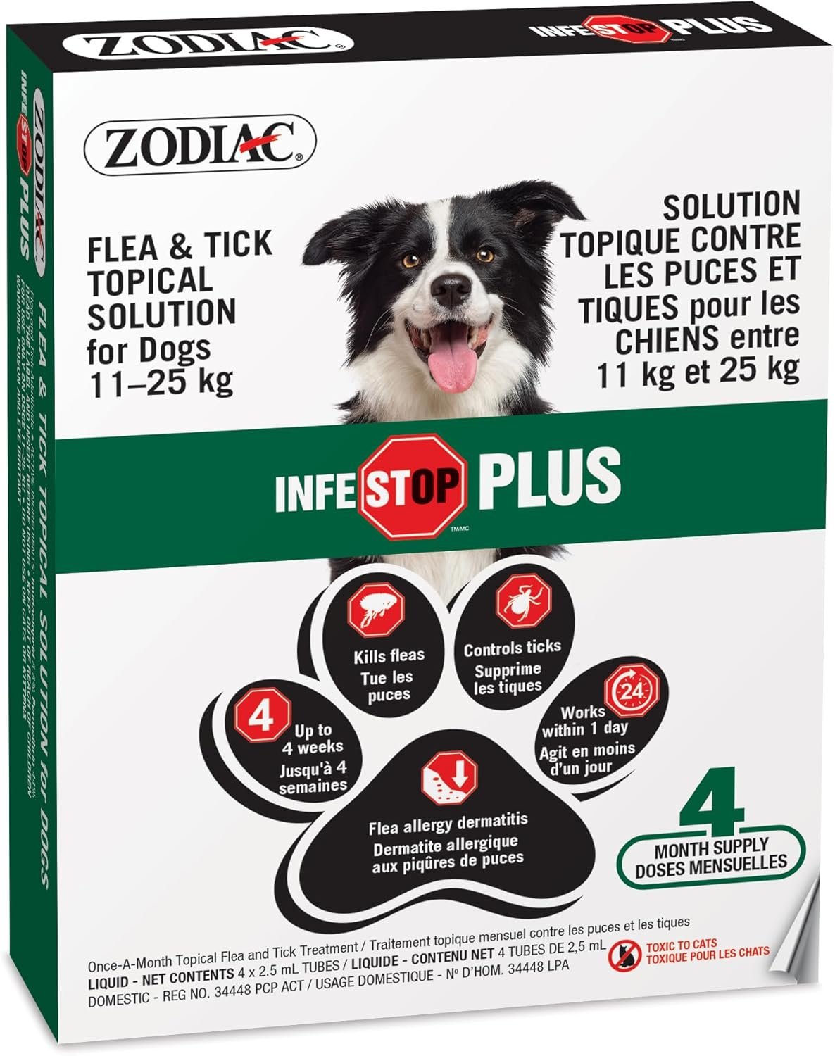 If you prefer the use of topicals, ZODIAC Infestop PLUS for Dogs 11kg – 25kg offers an easy to use, effective and economical alternative. These products are designed to be used Once-A-Month. TRUSTED/PROVEN: VET TECHNOLOGY AVAILABLE WITHOUT A VISIT TO THE VET Flea & Tick Adulticide Rapidly kills fleas Controls fleas and ticks within 1 day of treatment Protects for up to 4 weeks The successive feeding activity of fleas on pets may elicit a hypersensitivity skin disorder known as flea allergy dermatitis (FAD). Infestop PLUS Topical Solution rapidly kills fleas and may reduce the incidence of this condition. Controls fleas within 1 day of treatment. FOR USE ONLY ON DOGS 11KG – 25 KG. DO NOT USE ON CATS OR KITTENS. TOXIC TO CATS. KEEP OUT OF REACH OF CHILDREN. READ THE LABEL AND INSERT BEFORE USING. 4 MONTH SUPPLY.
