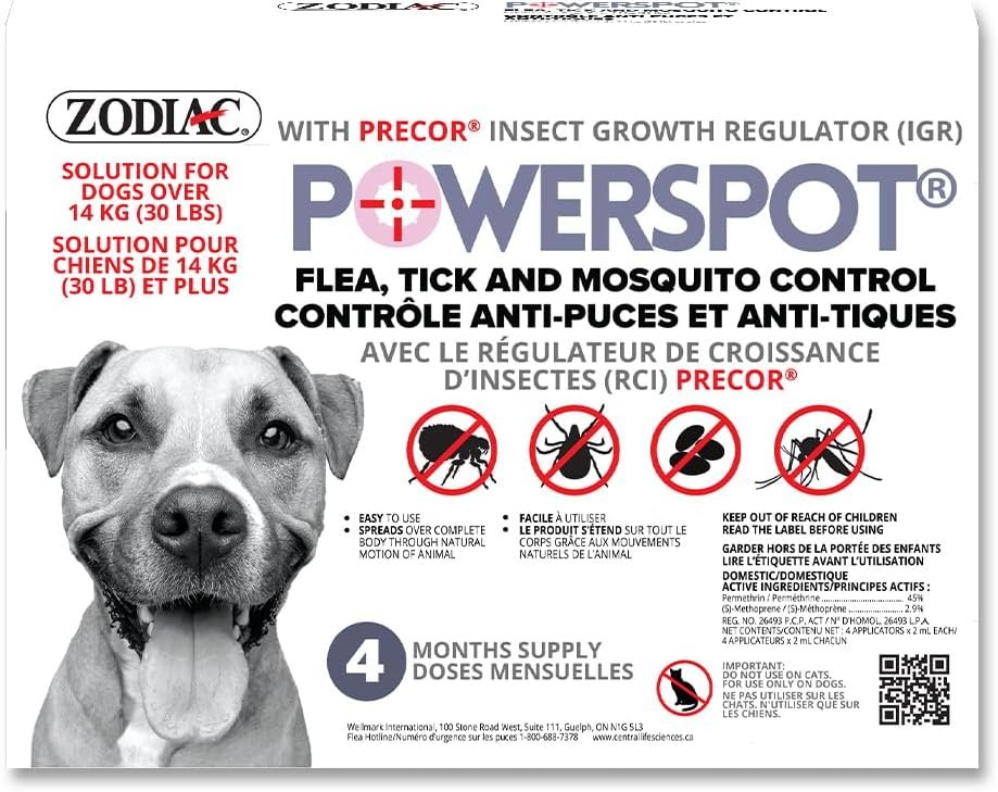 Zodiac® PowerSpot® Flea & Tick Control for Dogs Over/Under 14 kg (30 lbs) – With Precor® Insect Growth Regulator (IGR) If you prefer the use of topicals, Zodiac® PowerSpot® Flea & Tick Control for Dogs Over/Under 14 kg (30 lbs) will offer an effective and economical alternative. These products are designed to be used once a month. • 4 Month Supply DO NOT USE ON CATS Cats that actively groom or engage in close physical contact with recently treated dogs may be at risk of harm. Sizes: • 4 Tubes × 1 mL Each (under 14 kg) • 4 Tubes × 2 mL Each (over 14 kg) Active Ingredients: Permethrin 45%/(S)-Methoprene 2.9%