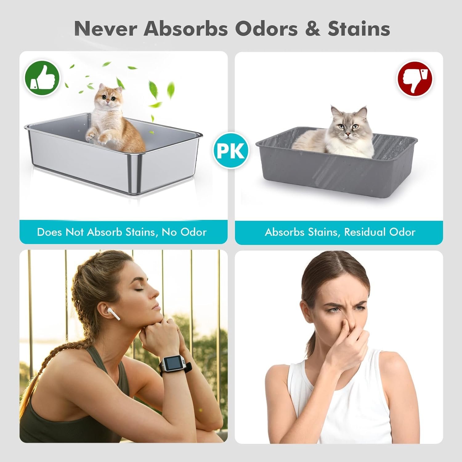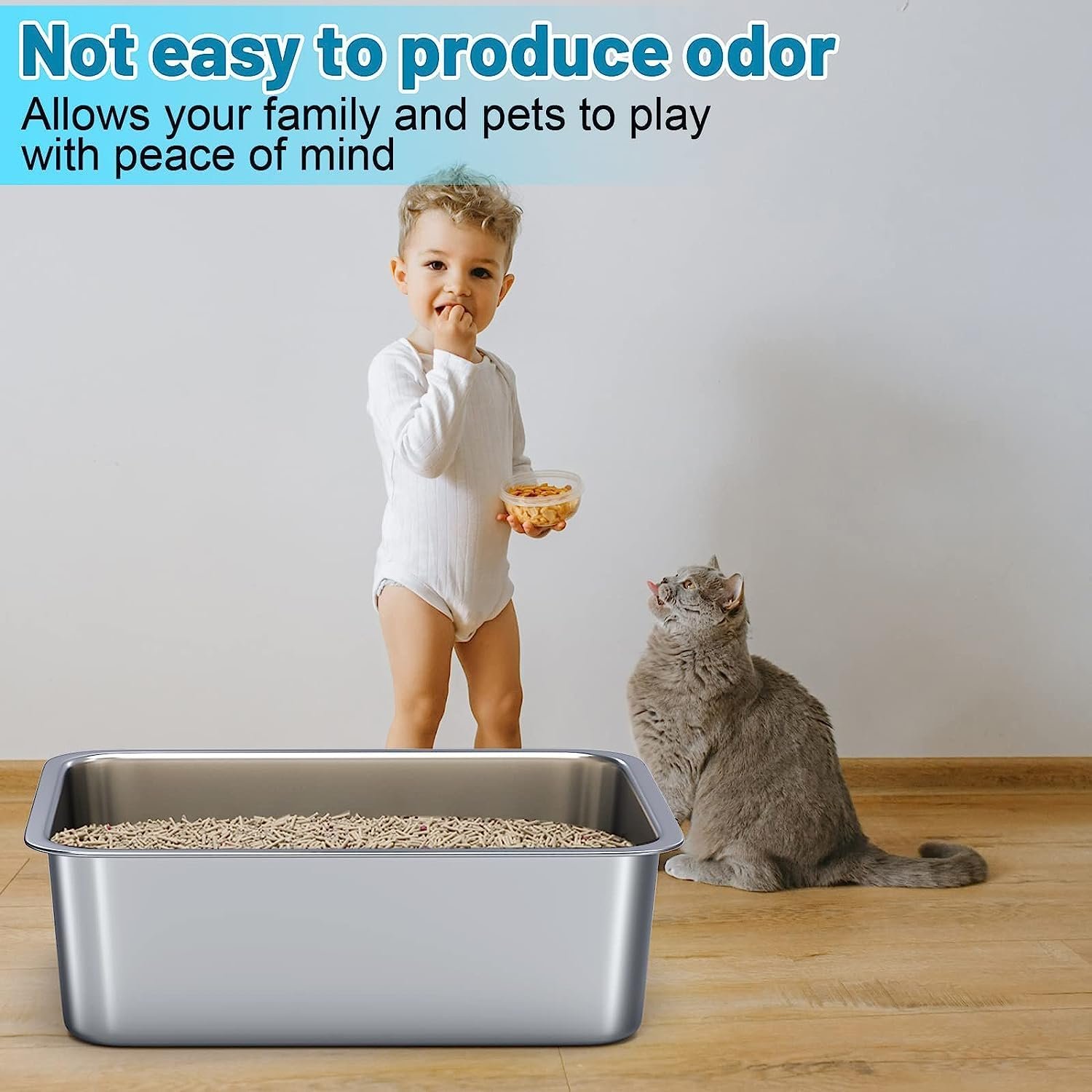 QUALITY MATERIAL – Our large litter boxes are made of quality stainless steel, which are long lasting, rustproof, scratchproof, eco-friendly; Our litter boxes are extremely sturdy for active cats or rabbits, and can be applied for a long time.