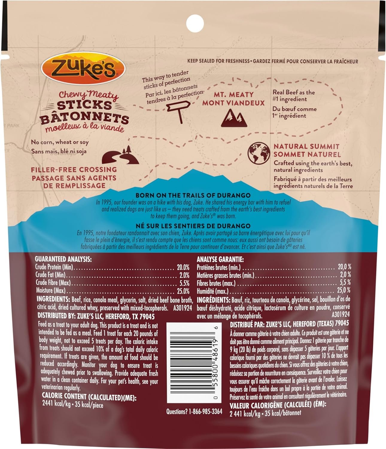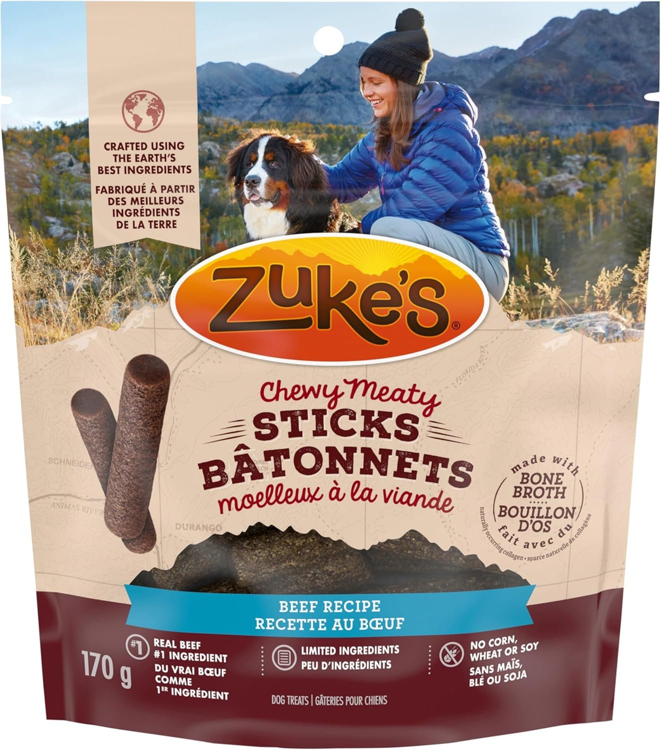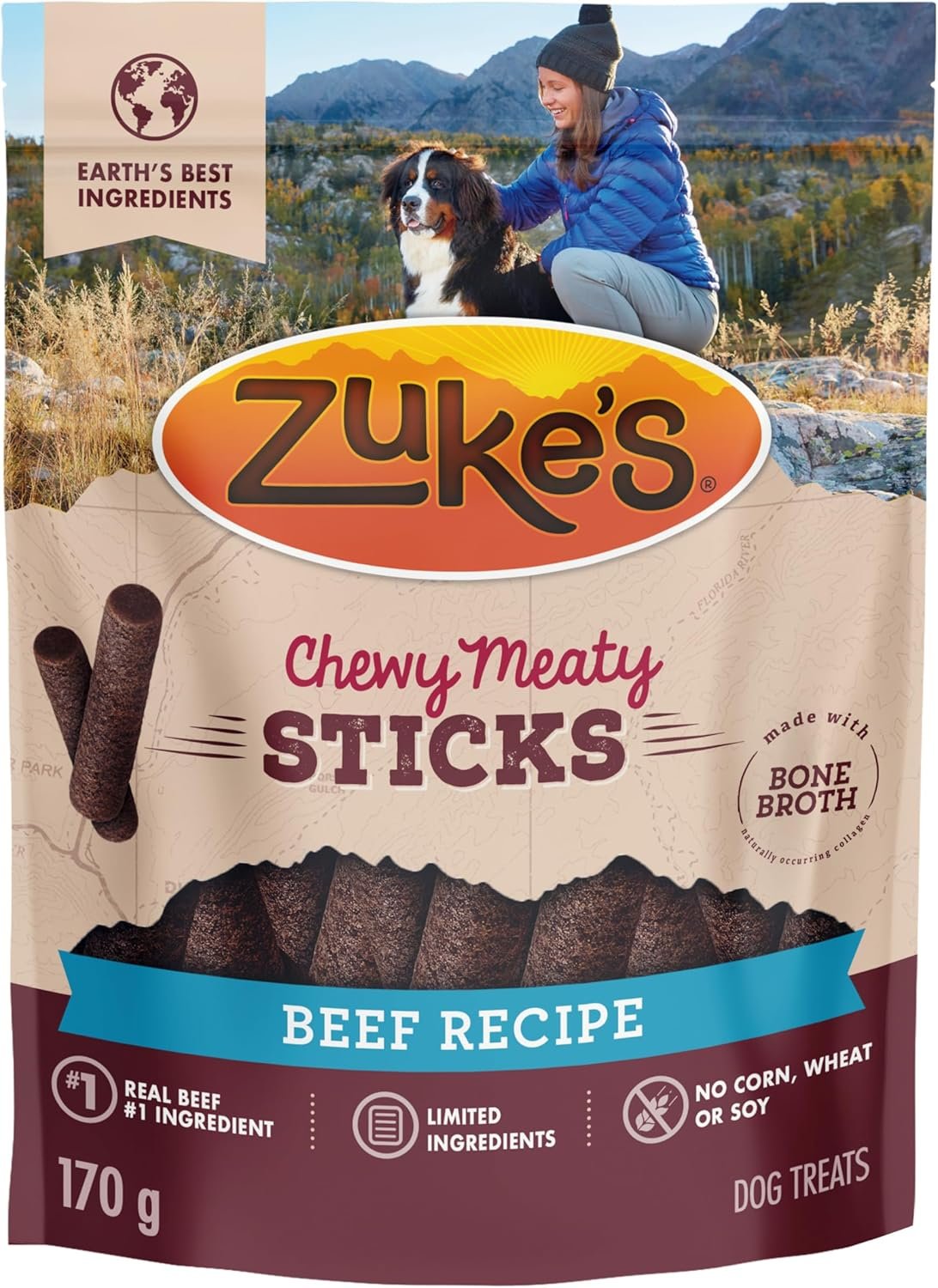 Training is one of the biggest adventures you and your dog will set off on together. And with the right treat, you can keep each and every moment rewarding and deliciously fun. Zuke’s Chewy Meaty Sticks are made with high-quality ingredients like real beef and bone broth, a source of naturally occuring collagen. These soft, chewy sticks can be fed whole or broken apart into bite-sized pieces to fit any treating moment. Zuke’s Chewy Meaty Sticks come in a resealable pouch for your convenience and are great for dogs of all breeds and sizes.